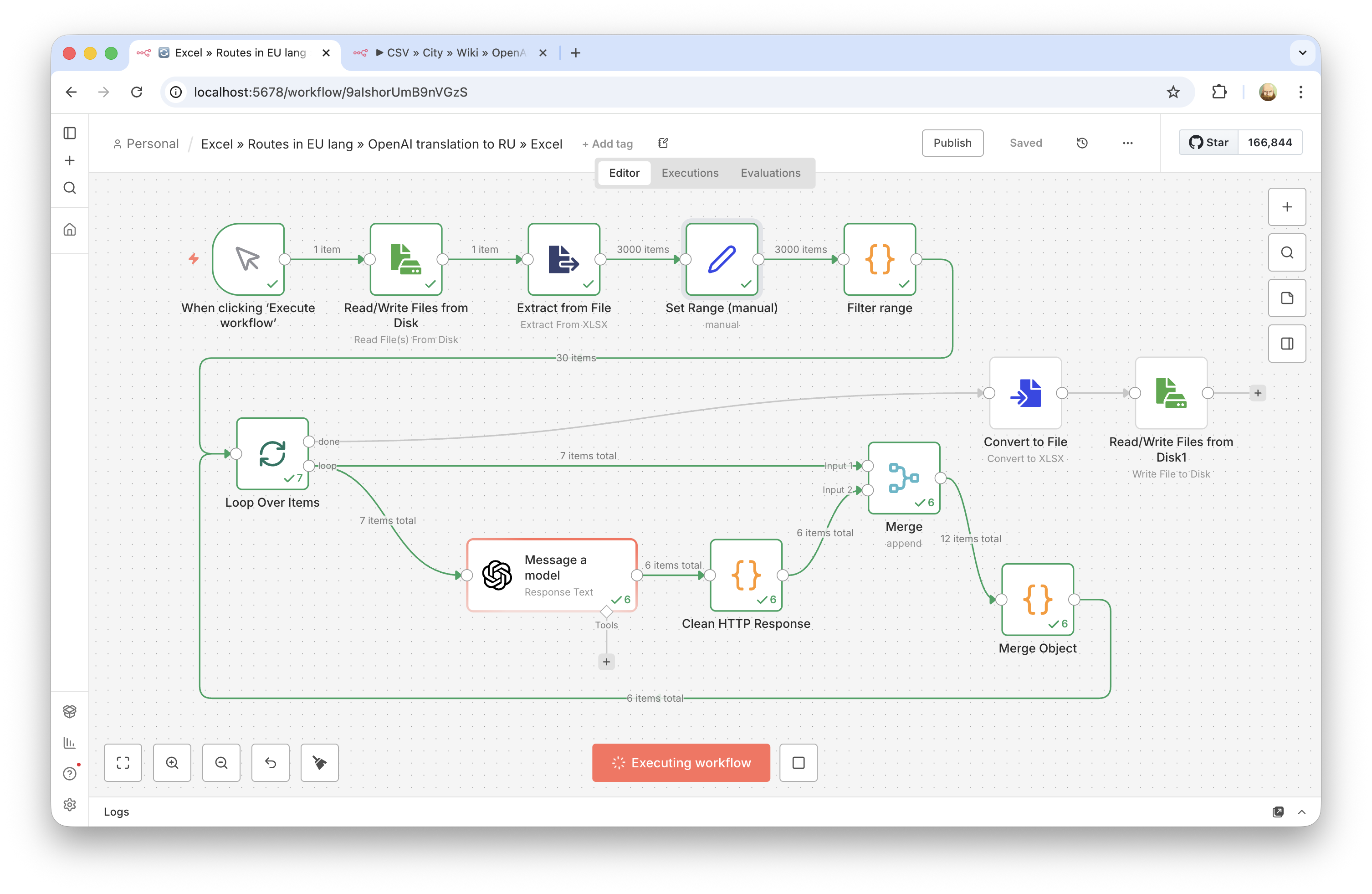 Для задачи был собран workflow в n8n, который обрабатывает строки таблицы пакетно, отправляет в OpenAI перевод названия и описания, получает строго структурированный ответ и записывает результат обратно в выходной файл.