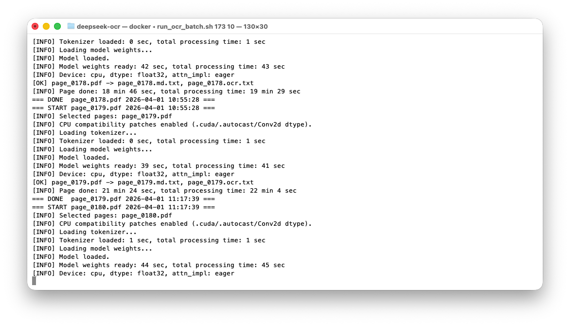 Вот как выглядела работа в терминале: в приложенном фрагменте для страниц 0178 и 0179 время обработки одной страницы составляло примерно 18-21 минуту, а загрузка весов модели перед обработкой занимала около 39-44 секунд.