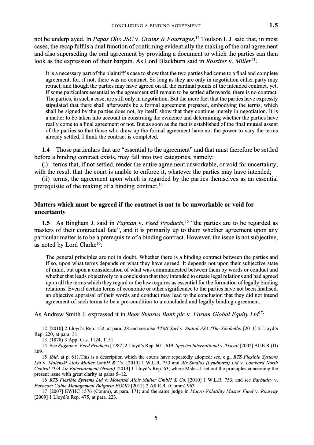 1.5 As Bingham J. said in Pagnan v. Feed Products, \( ^{15} \) “the parties are to be regarded as masters of their contractual fate”, and it is primarily up to them whether agreement upon any particular matter is to be a prerequisite of a binding contract. However, the issue is not subjective, as noted by Lord Clarke \( ^{16} \) :