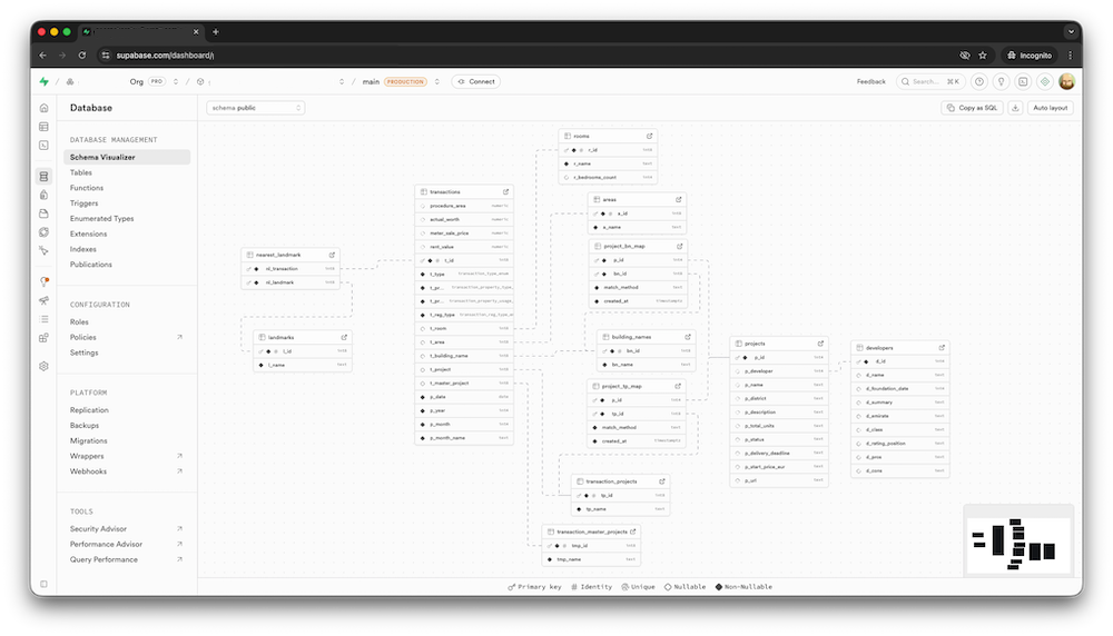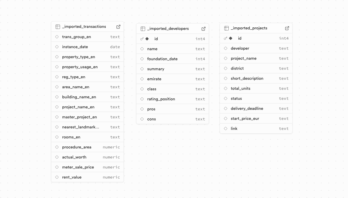 Данные были загружены в Supabase "как есть": без предварительной подготовки схемы, с разнородными типами полей и неустойчивыми значениями (тексты, даты, числа, названия проектов).